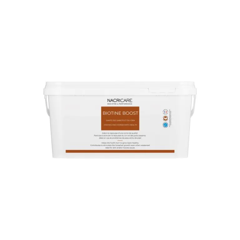 Enfin, la biotine a des propriétés connues et reconnues sur la croissance et la qualité de la corne des sabots ainsi que sur la pousse du poil et des crins .