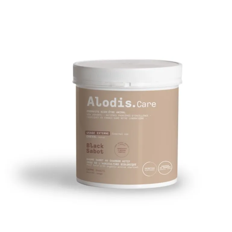 Le Black Sabot Alodis Care est un baume pour sabots au charbon actif issu de l’agriculture biologique. Il a une action sur les fourchettes pourries et gère les toxines avec le charbon.