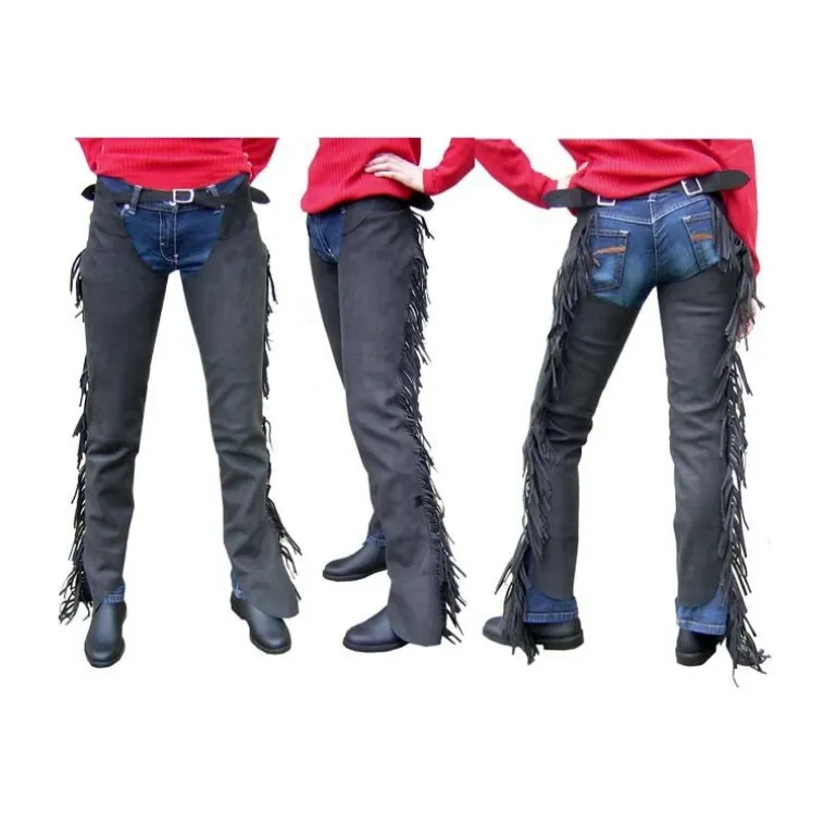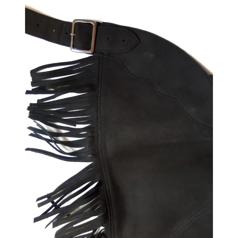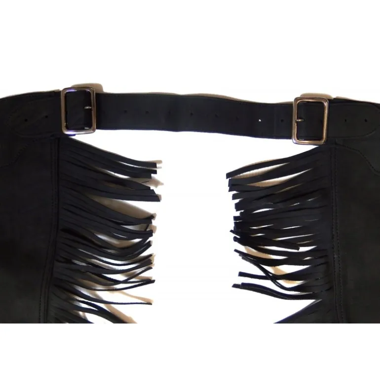 Les jambes sont plus longues sur l’extérieur. Elle sont habillées de franges de 10 cm de long pour un style western.