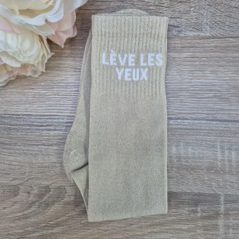 Les chaussettes pailletées “Lève les yeux” glissent un rappel plein d’humour pour améliorer la posture, sans perdre le style.
