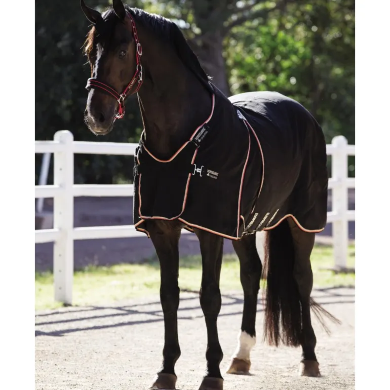 Cette couverture comporte une double fermeture avec bandes velcro et boucles métalliques, trois sursangles ventrales ainsi qu’une courroie de queue pour une tenue parfaite.