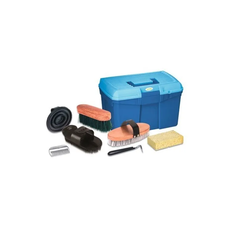 Prenez soin de votre monture grâce à ce kit complet de sept pièces contenues dans un coffre de pansage en plastique. Il comprend une étrille en caoutchouc, un cure-pied, une éponge en viscose, une étrille finlandaise, une brosse douce avec un peigne à crinière ainsi qu’un bouchon.
