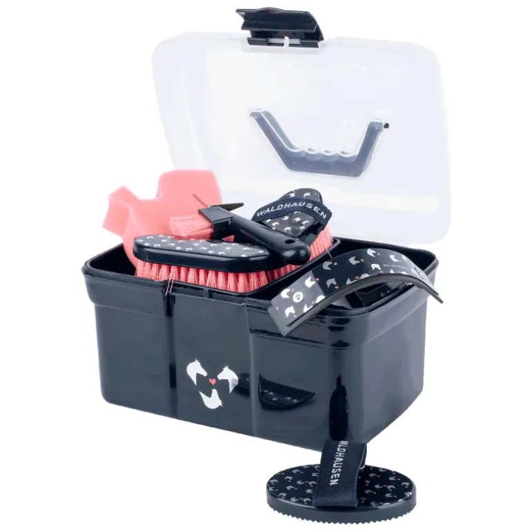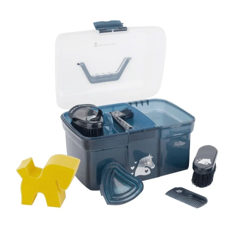Ce joli contenant est garni de sept accessoires assortis: un bouchon, une brosse douce, un peigne à crinière, un cure-pied, un couteau de chaleur, une étrille cœur et une éponge cheval.