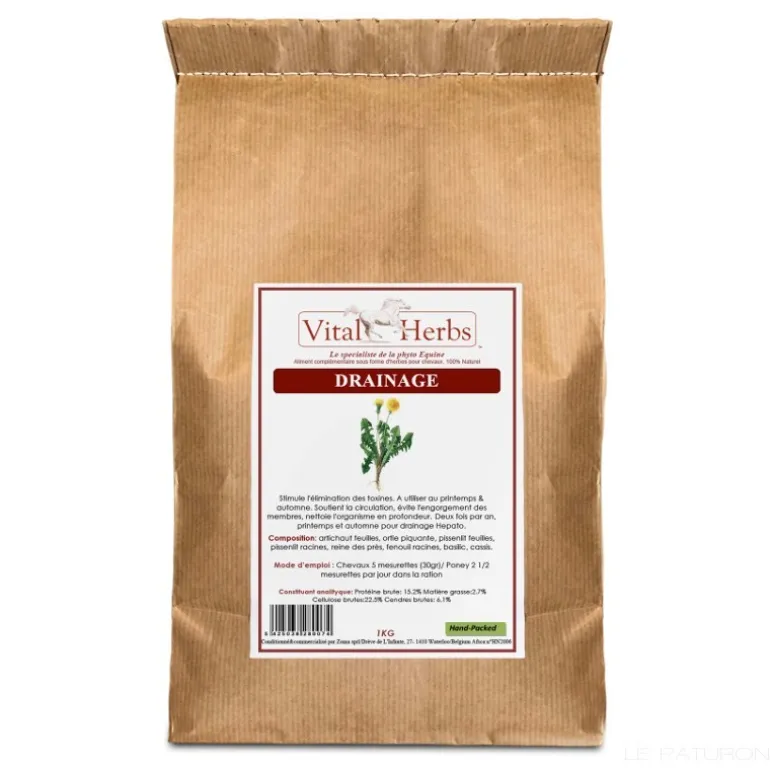 Le mélange Drenalis (Drainage & Fourbure) de la marque Vital Herbs a été exclusivement formulé à base de plantes sélectionnées afin d’optimiser les fonctions de drainage de l’organisme des chevaux et des poneys.
