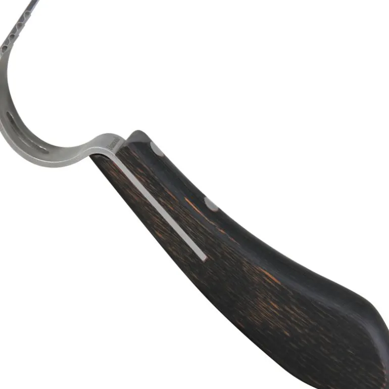 Confortable en main grâce à son large manche en bois, sa forme recourbée à la pointe affinée lui permet d’enlever efficacement et à moindre effort la terre et les débris sous les sabots, même dans les endroits difficiles d’accès comme le fond des lacunes.