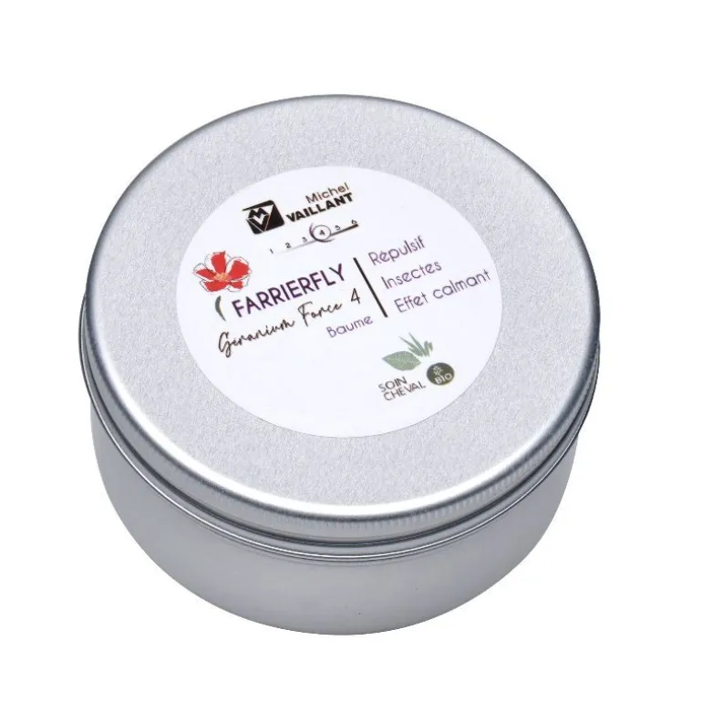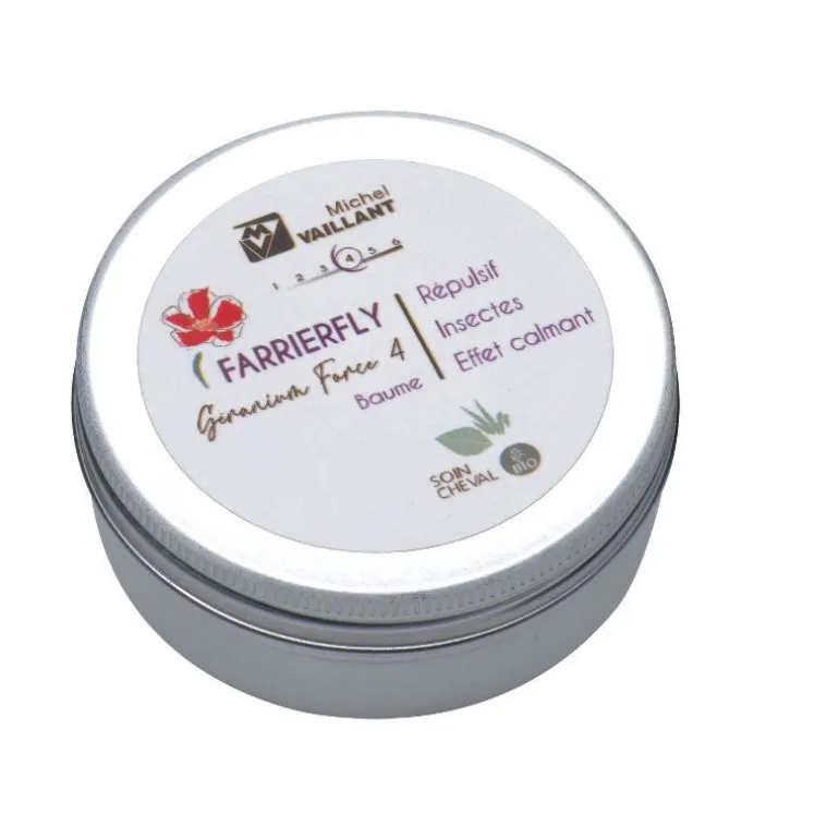 Le baume Farrierfly Bio Géranium Répulsif Calmant Force 4 Michel Vaillant possède une action répulsive anti-insectes mais également un effet calmant.