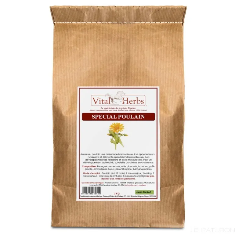 Spécial Poulain de la marque Vital Herbs est un mélange dont les propriétés permettent au poulain d’avoir une croissance harmonieuse et équilibrée et apportent tous les nutriments, vitamines, minéraux et oligo-éléments indispensables à son bon développement tant sur le plan osseux que musculaire.