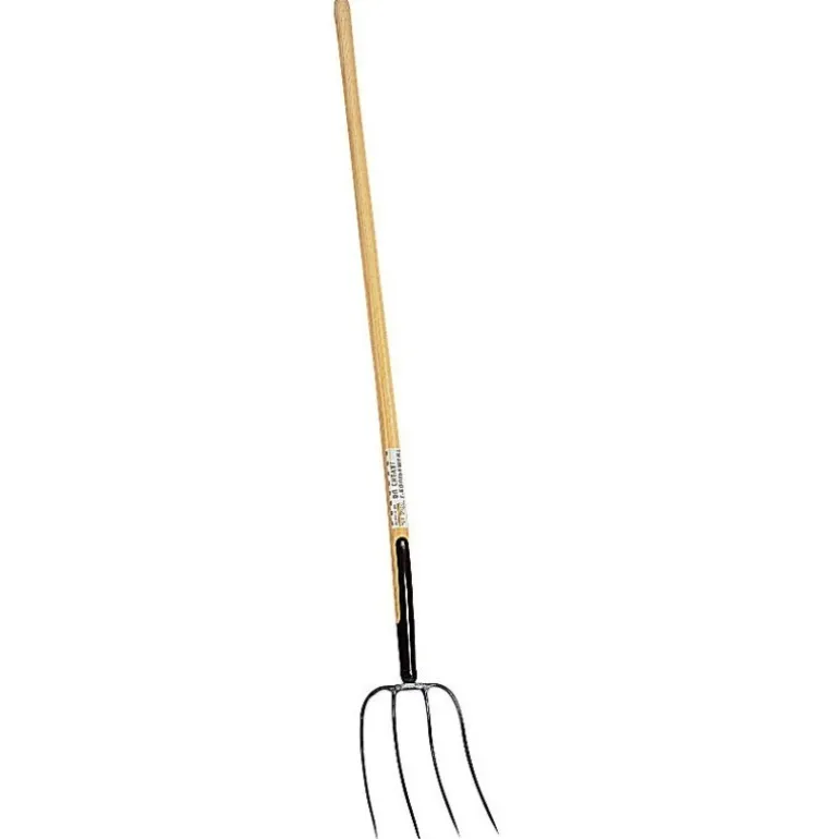 Cette fourche à foin en acier avec quatre dents est montée sur un solide manche en bois à l’aide d’un emmanchement à douille.