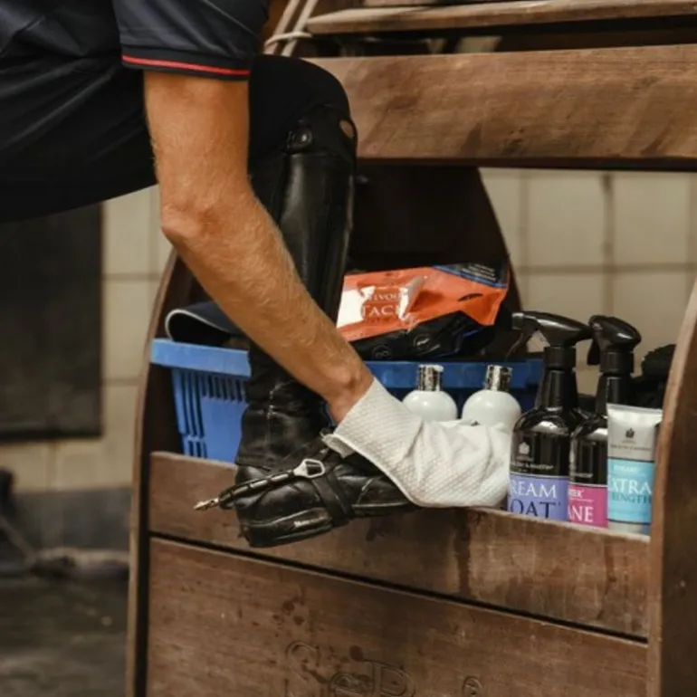 Indispensables en concours, les gants de nettoyage Belvoir Carr and Day and Martin Tack Cleaner vous permettent de faire briller votre cuir pour tout événement.