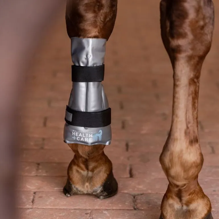 Cet accessoire de soin se positionne fermement autour de la jambe préalablement bandée grâce à deux sangles velcro. Il est primordial de vérifier la température avant de placer l‘équipement sur le cheval.