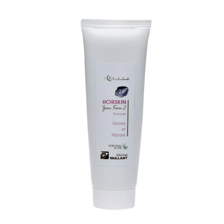 Particulièrement indiquée sur les blessures, brûlures, crevasses et plaies superficielles, la pommade Horskin Réparatrice Zinc Force 2 Michel Vaillant facilite la réparation cutanée du cheval.