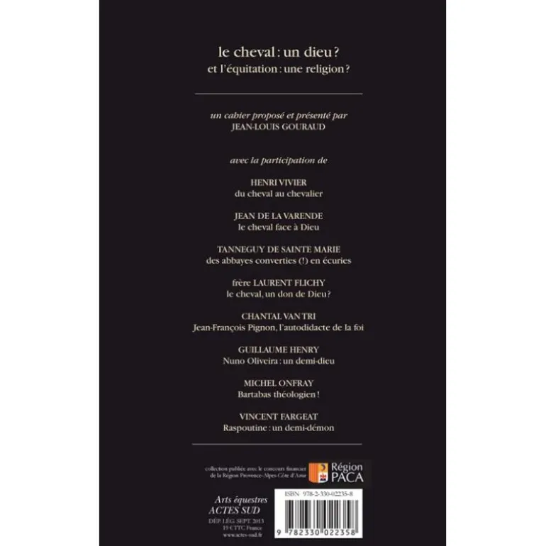 Avec la participation de Henri Vivier du cheval au chevalier ; Jean de La Varende le cheval face à Dieu ; Tanneguy de Sainte Marie des abbayes converties (!) en écuries ; frère Laurent Flitchy le cheval, un don de Dieu ? ; Chantal Vantri Jean-François Pignon, l’autodidacte de la foi ; Guillaume Henry Nuno Oliveira : un demi-dieu ; Michel Onfray Bartabas théologien ! ; Vincent Fargeat Raspoutine : un demi-démon.