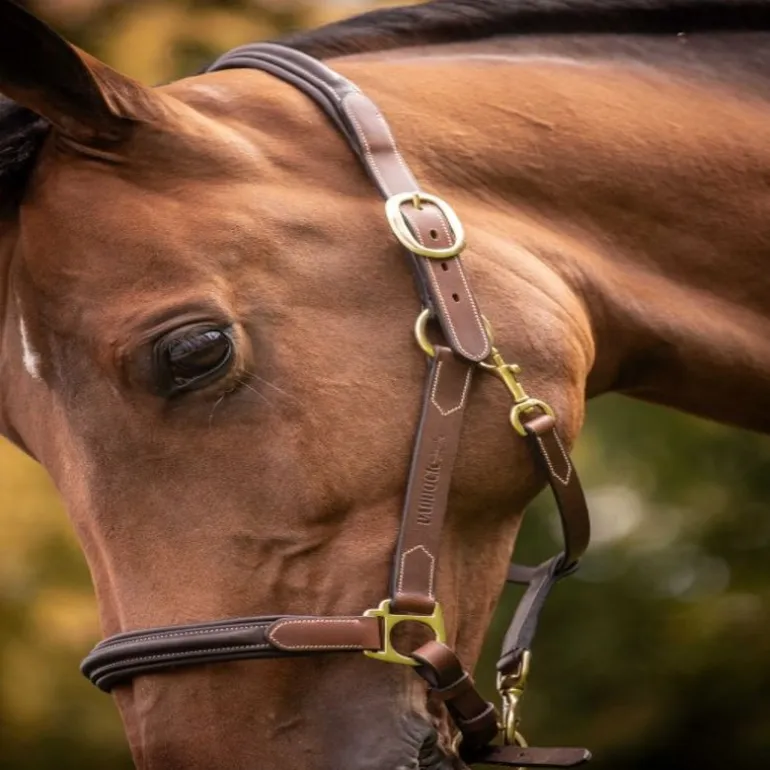 Le licol Paddock Sports en cuir bicolore est doté de trois mousquetons : un premier sous la muserolle, et deux autres, de chaque côté, sur les montants. Ces trois mousquetons permettent une manipulation facile et une pose/dépose facile sur la tête du cheval notamment lors du pansage.
