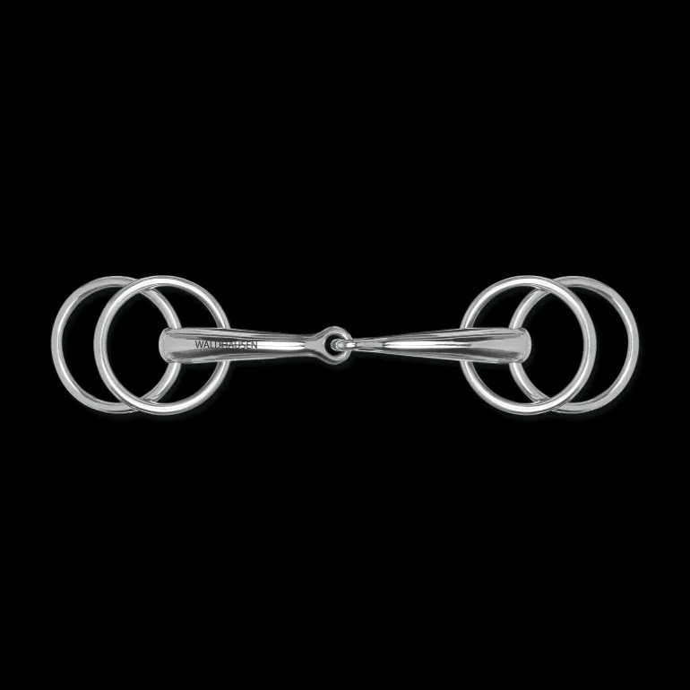 Confectionné en inox massif, ce mors brisé est équipé de quatre anneaux, deux pour fixer les montants du mors –intérieur– et deux pour les rênes –extérieur–. Cette double attache assure une meilleure stabilité en bouche qu’une embouchure classique.