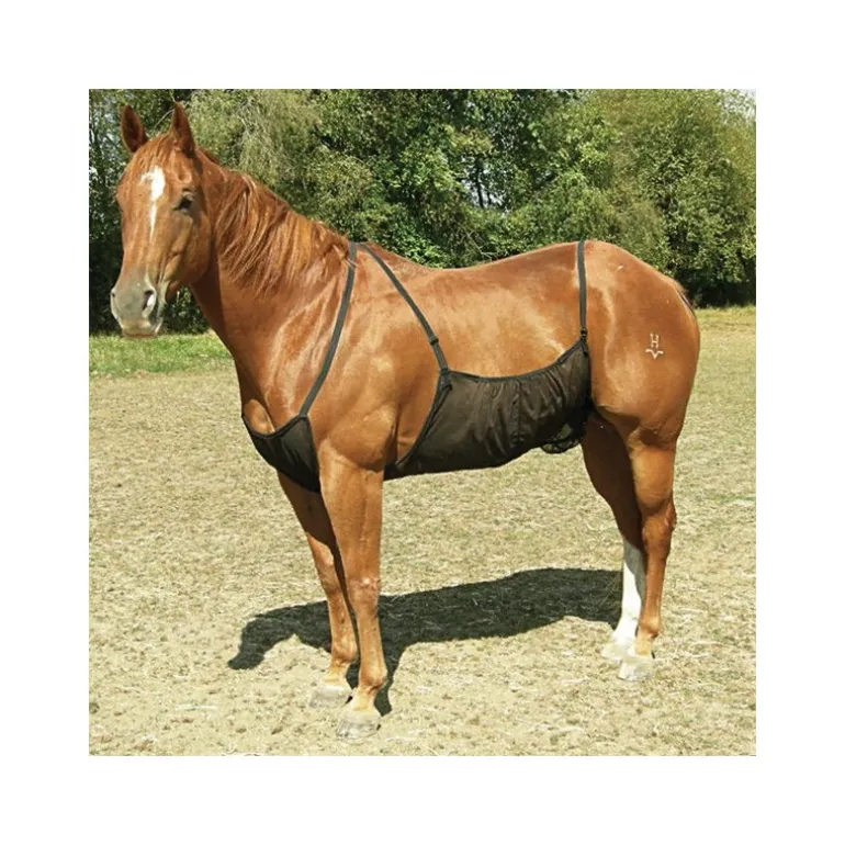 Cette protection protège les chevaux contre les mouches, les taons, les moustiques ou autres insectes qui se posent parfois autour du nombril et du sternum. Elle est maintenue en place par des sangles.
