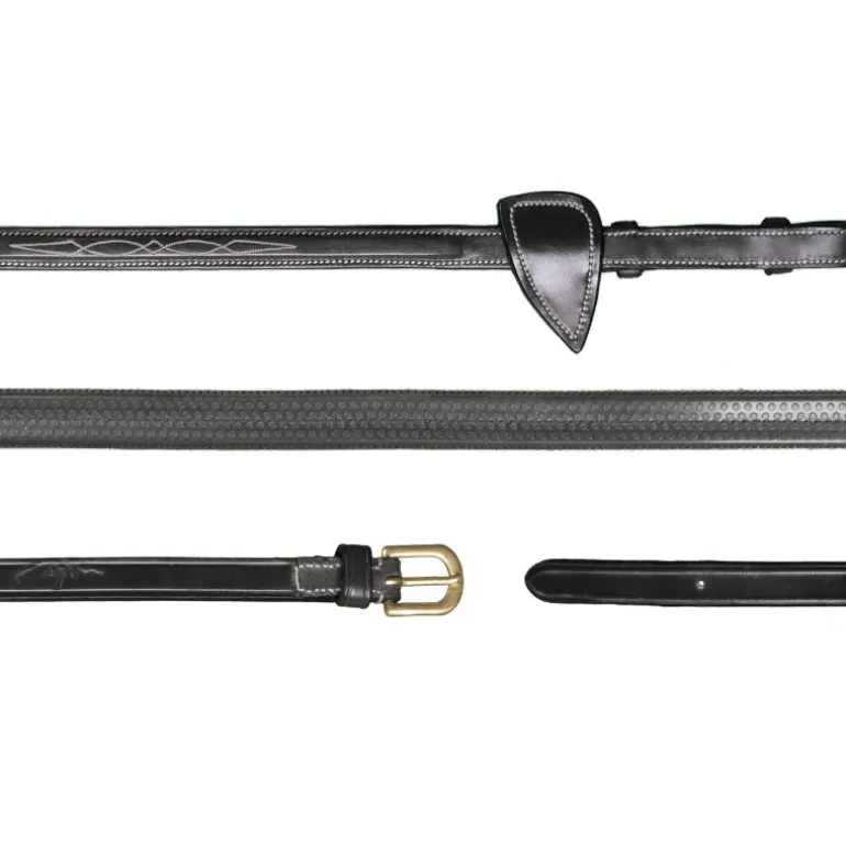 Fabriquée dans un cuir Catalan de qualité et au tannage végétal, la paire de rênes D Collection Dy’on est munie d’une partie en caoutchouc à picots souples afin de vous garantir un maintien parfait lors de vos séances de travail.