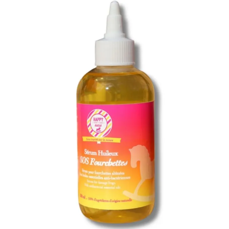Sous la forme d’un sérum huileux, ce soin naturel est riche en huiles végétales et en huiles essentielles antifongiques et antibactériennes afin de protéger et assainir les fourchettes abîmées ou pourries.