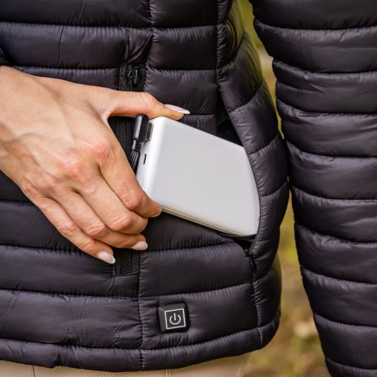 La poche batterie discrète maintient la batterie bien en place et à l’abri, tandis que les deux grandes poches avant sont pratiques pour réchauffer vos mains ou ranger vos essentiels.