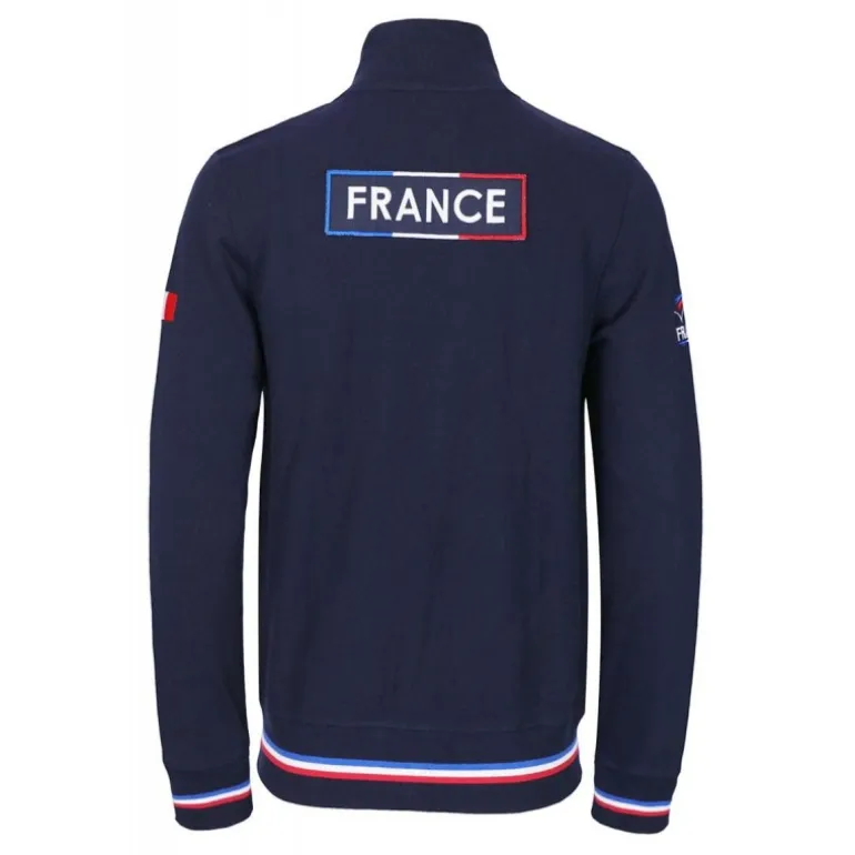 En matière coton et polyester elle est équipée de bords côtes élastiques aux couleurs de la France au niveau de la taille et des poignets et de poches zippées.
