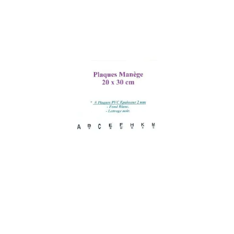 Ce jeu de 8 plaques de lettres de dressage permet de créer des repères dans votre manège. Les lettres sont inscrites en noir sur fond blanc. Elles sont collées sur des plaques de PVC, plastique robuste nécessitant peu d’entretien.