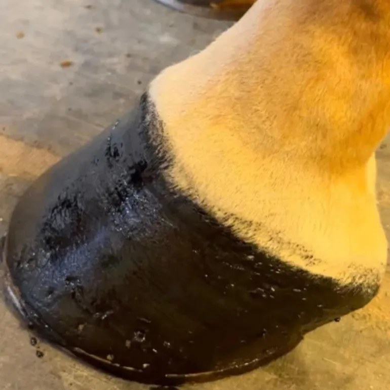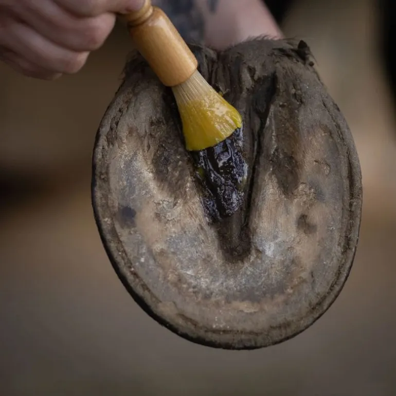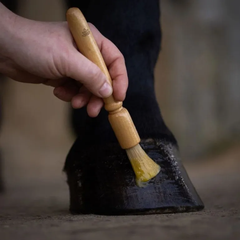 – Après avoir nettoyé (et si besoin séché) la zone d’application, munissez vous d’un pinceau et appliquer le baume sur la corne, la sole, la fourchette et les glomes en insistant bien sur la paroi et la couronne périoplique