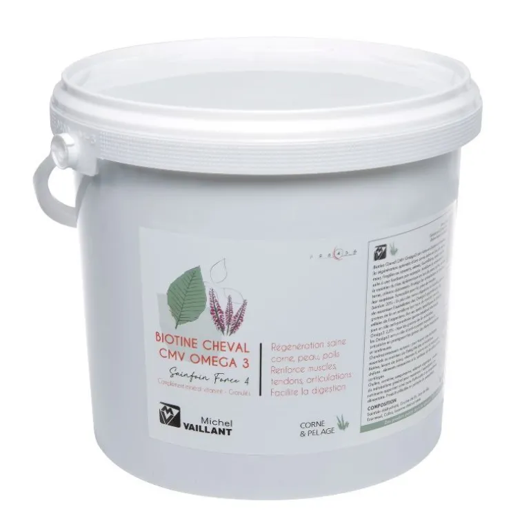 Agissant favorablement sur la prise de muscles, la biotine CMV Oméga 3 Force 4 Granulés Michel Vaillant optimise la régénération de la corne en cas de sabots mous, cassants, fragiles, fourmilières, seimes ou encore pieds cerclés suite à une fourbure.
