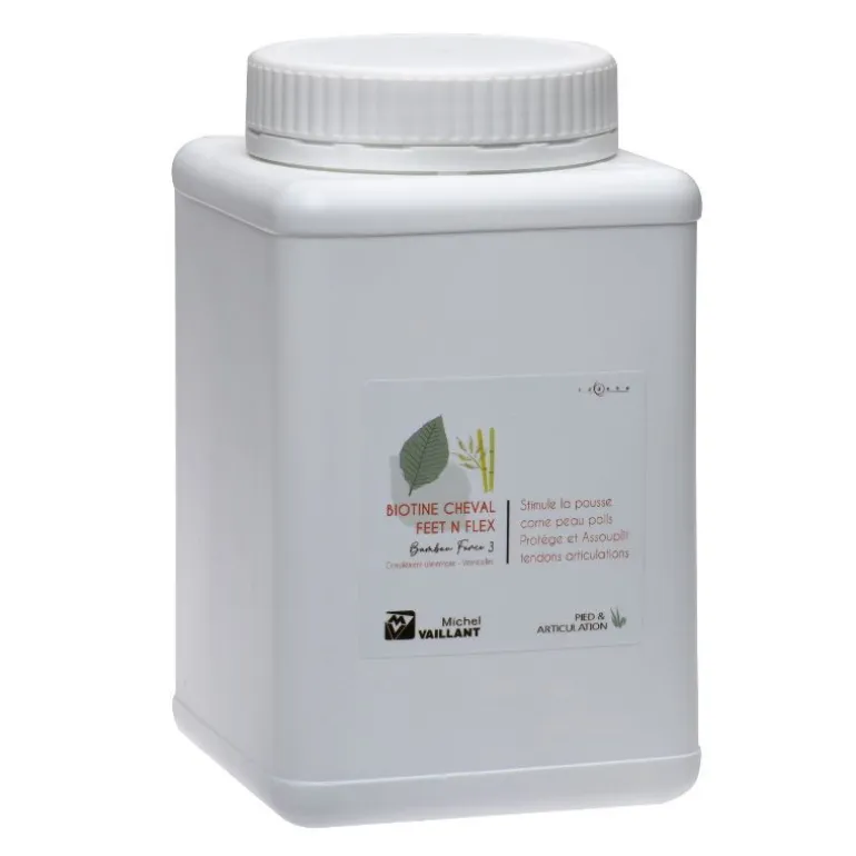 Sous forme de vermicelles, la biotine Feet N Flex Vermicelles Force 3 Michel Vaillant est un véritable complément innovant combinant deux actions : optimisation de la pousse et de la qualité de la corne par l’apport de vitamine H (biotine) et protection des articulations et amélioration de leur souplesse par l’apport de glucosamine et de chondroïtine