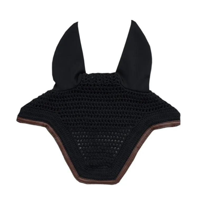 Confectionné dans une maille aérée tricotée main, le bonnet anti-mouche Wellington Leather Soundless Kentucky Horsewear est renforcé d’un galon en simili-cuir brun sur son pourtour.