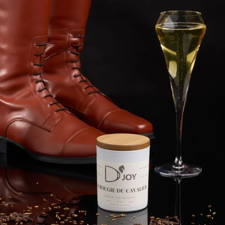 La bougie du cavalier D’joy cheval et senteurs, révèle la richesse et le raffinement d’un bois noir subtilement épicé pour une ambiance chaleureuse et élégante.