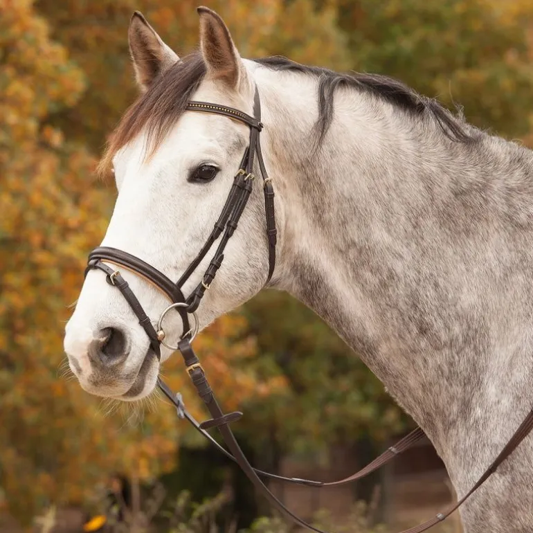 Doté d’une muserolle combinée et d’une têtière droite, le bridon Diamond apporte une touche de couleur à votre équipement. Son frontal est orné d’une rangée de strass et l’on retrouve une élégante doublure contrastante assortie au niveau du frontal et de la muserolle. La bouclerie est confectionnée en fer nickelé.