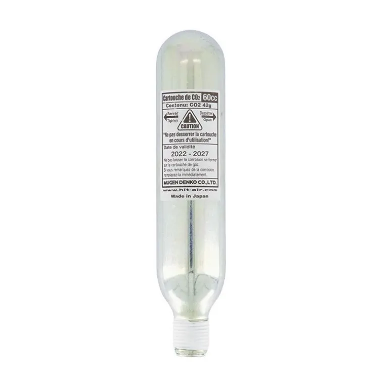 Pourvue d’une étiquette noire, la cartouche 60cc pèse 186 g brut et contient 45 g de Co². Elle est compatible avec les modèles suivants :