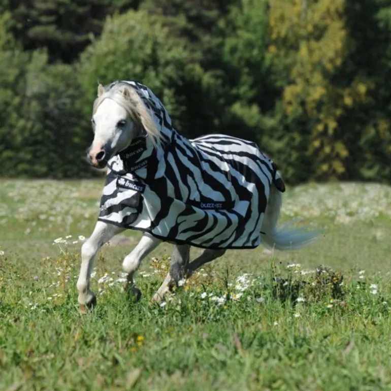 Fabriquée dans un tissu extrêmement léger avec un motif original à rayures, la chemise anti-mouche Buzz-off Zebra de la marque Bucas assure une protection efficace contre les mouches et les coups de soleil à votre poney.