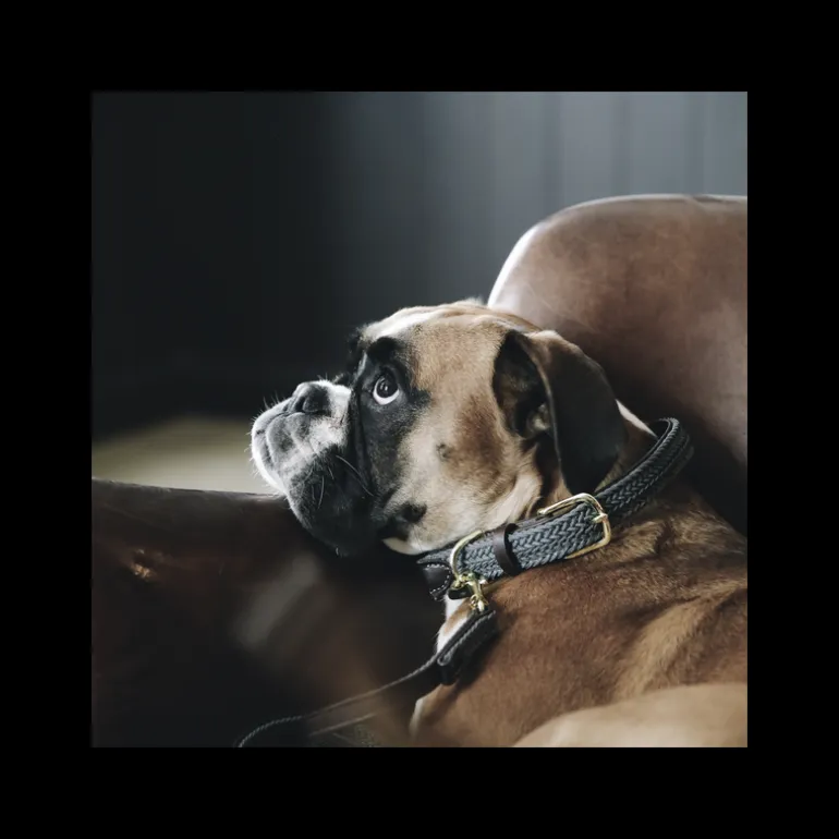 Confectionné dans un solide cuir synthétique de qualité, ce collier pour chien Kentucky Horsewear est doublé d’un élégant nylon tressé coloré.