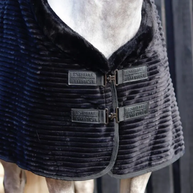La couverture de box Luxe Estrelle Equestrian se distingue par son tissu en fausse fourrure haut de gamme, alliant design raffiné et performance technique. Grâce à sa structure innovante composée de micro-chambres d’air 3D, elle assure une évacuation rapide de l’humidité vers l’extérieur, permettant ainsi un séchage efficace et un confort optimal pour votre cheval.