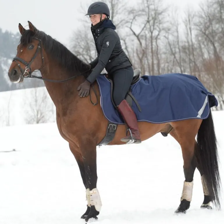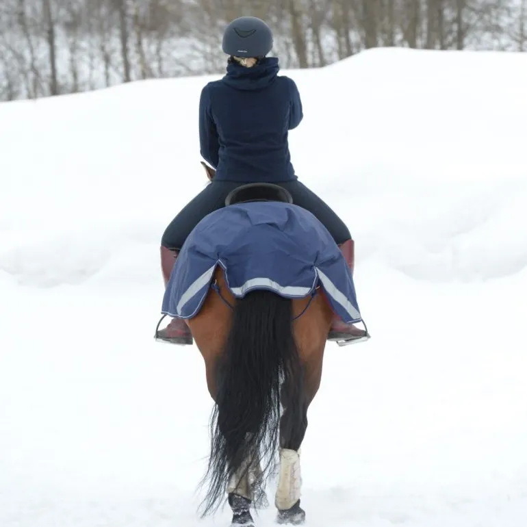 Pratique, il peut être positionné de tout son long sous la selle ou être déployé sur les jambes afin de protéger le cavalier en cas d’intempéries.