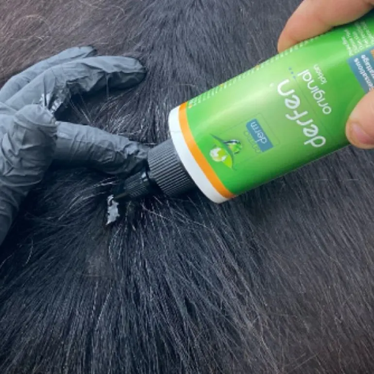Le Derfen Original Lotion Animaderm, la référence en dermites équines, apaise instantanément la peau irritée et grattée suite aux crises de dermite estivale chez les chevaux à peau fine.