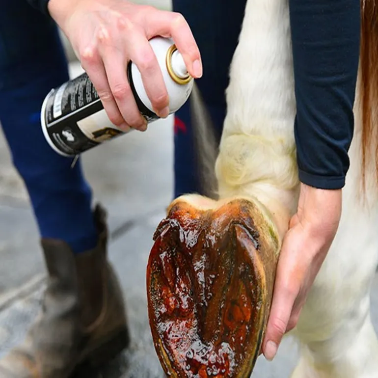 – Format spray : bien agiter le flacon avant utilisation, puis pulvérisez à 10/15 cm de la sole et de la fourchette