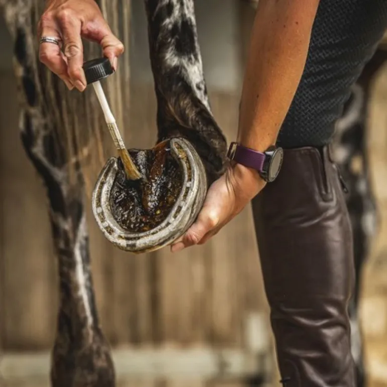 – Maintenir le sabot propre et appliquer Cornucrescine Hoof Oil quotidiennement en insistant bien au niveau du bourrelet périoplique