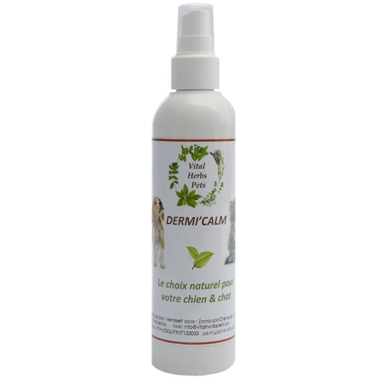 Idéal en cas d’irritation de la peau, le Dermi’Calm Vital Herbs est une lotion apaisante pour le chien et le chat.