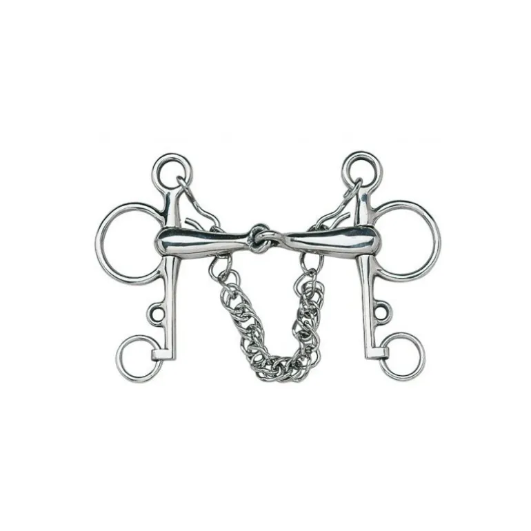 Ce mors Pelham en inox résistant est équipé d’un canon plein brisé et d’une gourmette. Il permet un fort effet de levier notamment grâce à sa gourmette qui démultiplie la force du cavalier. Cet équipement s’utilise de préférence sur un cheval ayant de l’impulsion.