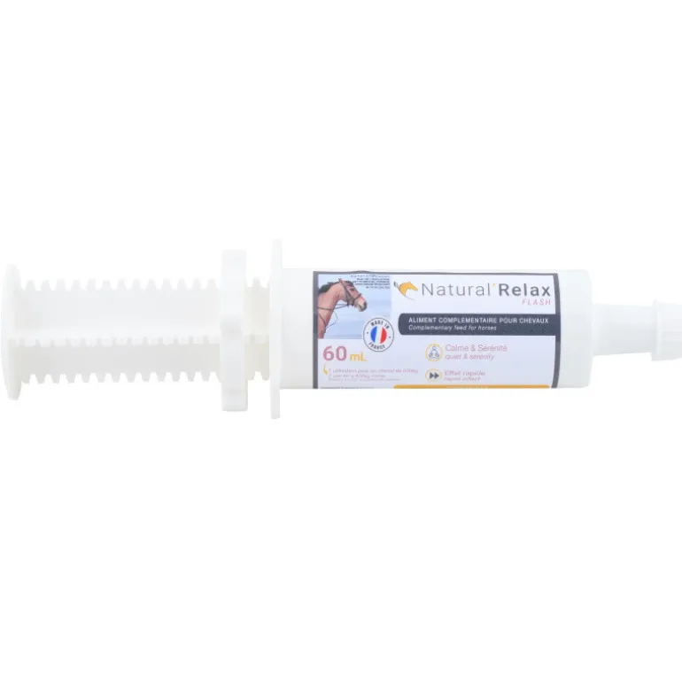 – Cheval/poney>1,35m : 1 seringue en 1 prise 1h à 2h avant la situation stressante (donner 1 seringue la veille au soir si besoin ou ½ la veille et ½ 2h avant)