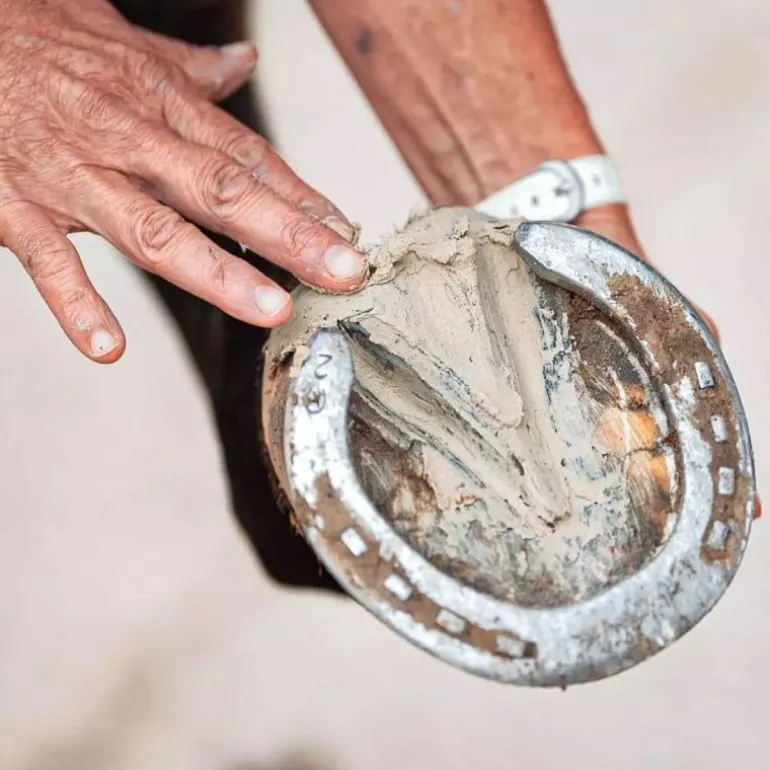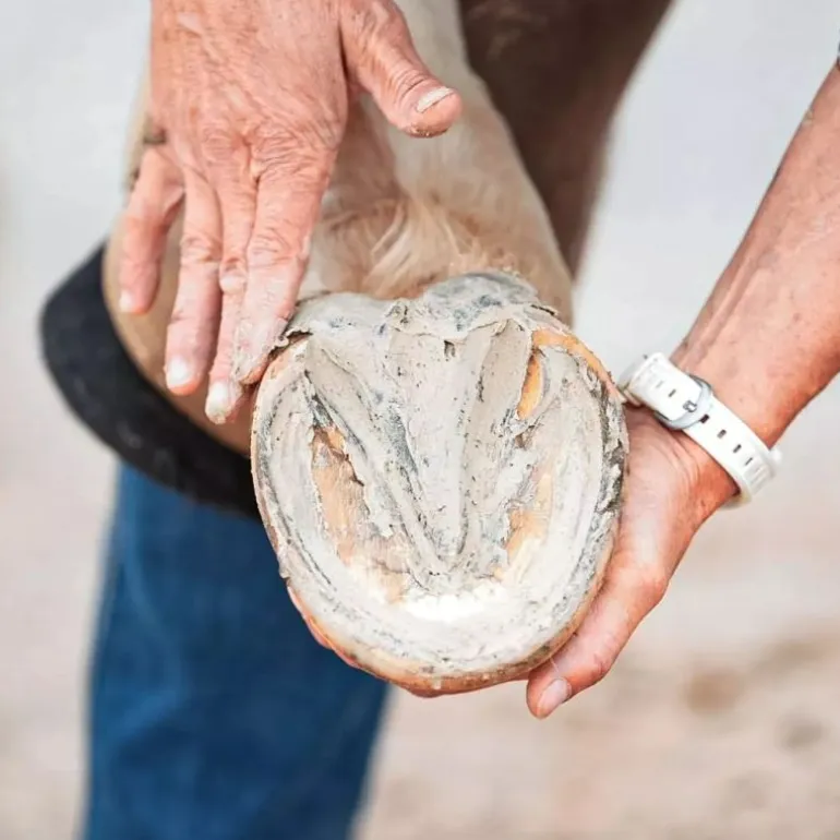 – Les propriétés absorbantes de l’argile contribuent à assainir le dessous du pied (lacunes, fourchette, glomes et sole)