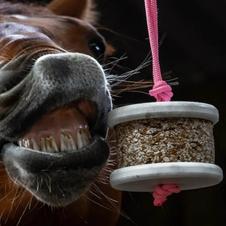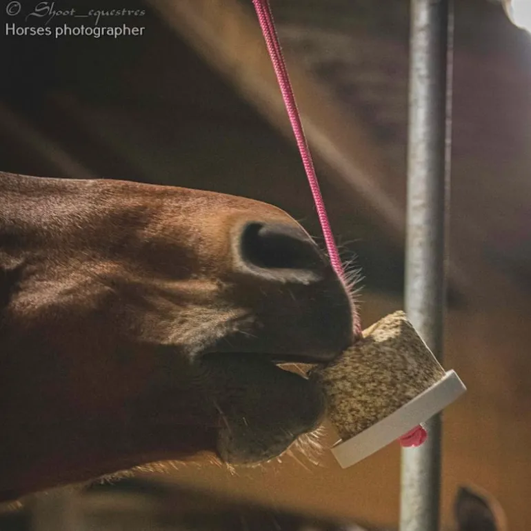 – Petit Tip’s : suspendez le jouet en l’éloignant autant que possible des murs ou barreaux, pour que votre cheval ne puisse pas le coincer facilement. Vous pouvez aussi lui mettre que pendant le pansage, un soin ou un transport.