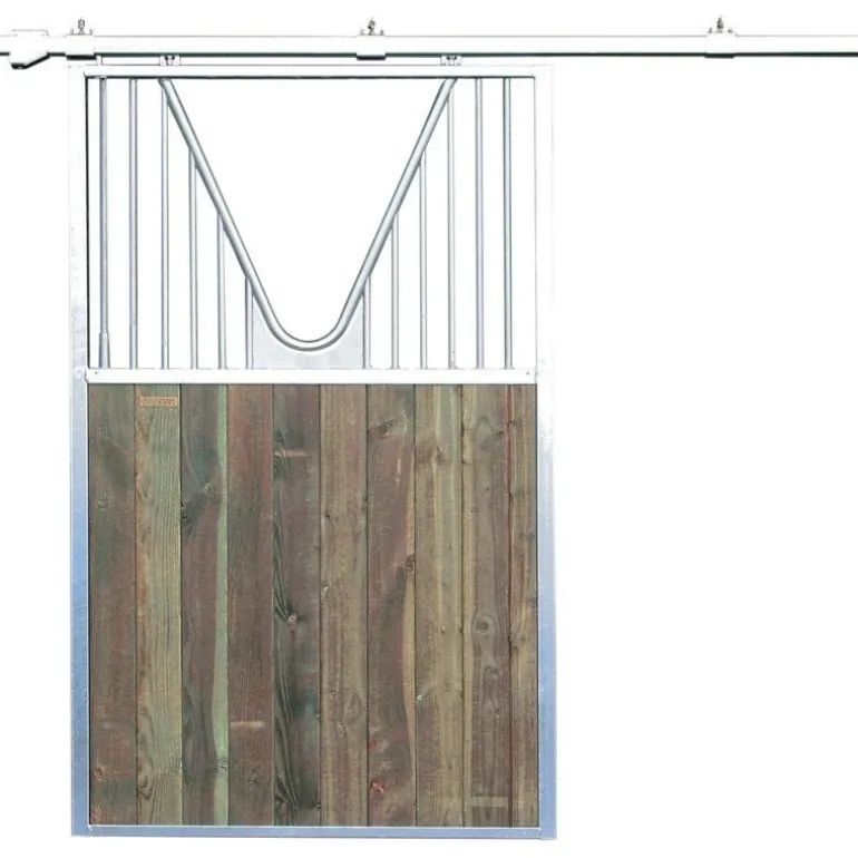 Elle se fixe sur un mur ou une façade de box. Suspendue par des roulettes coulissant dans un rail, elle est équipée d’un arrêt et d’une fermeture automatique, ainsi qu’un guide central qui la maintient en place.