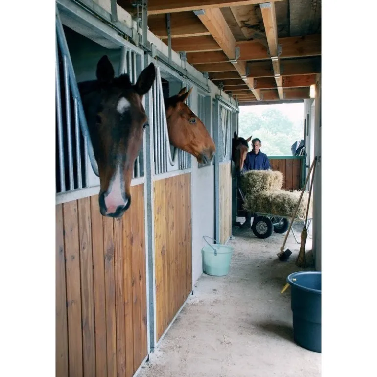 La porte de box coulissante en pin Douglas La Gée s’associe aux façades de box sans porte La Gée. Elle est disponible avec une grille pleine ou col de cygne pour le passage de la tête.
