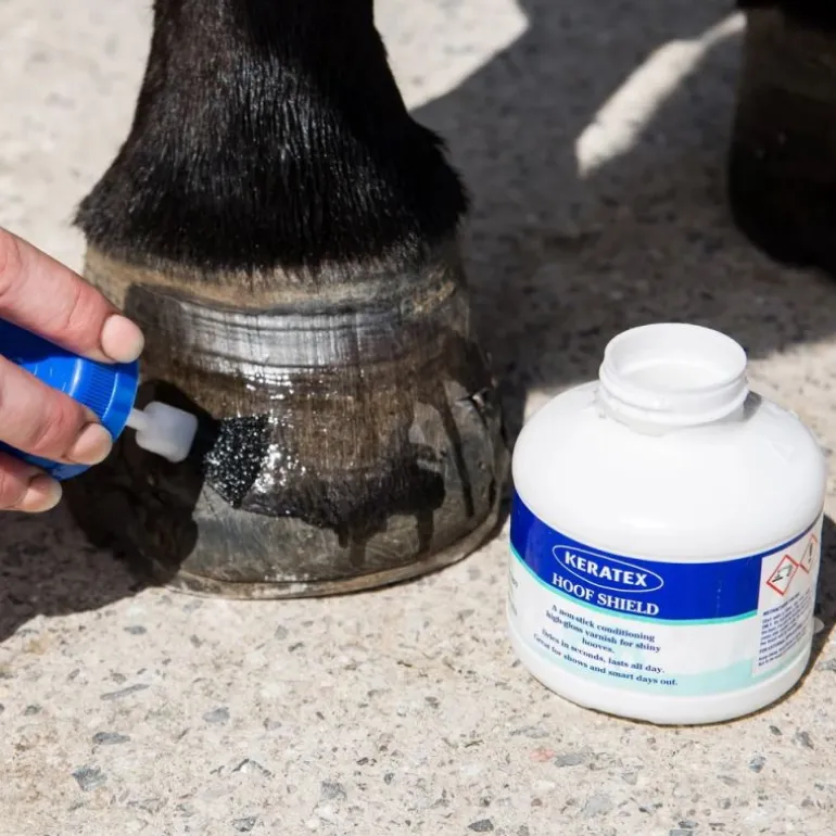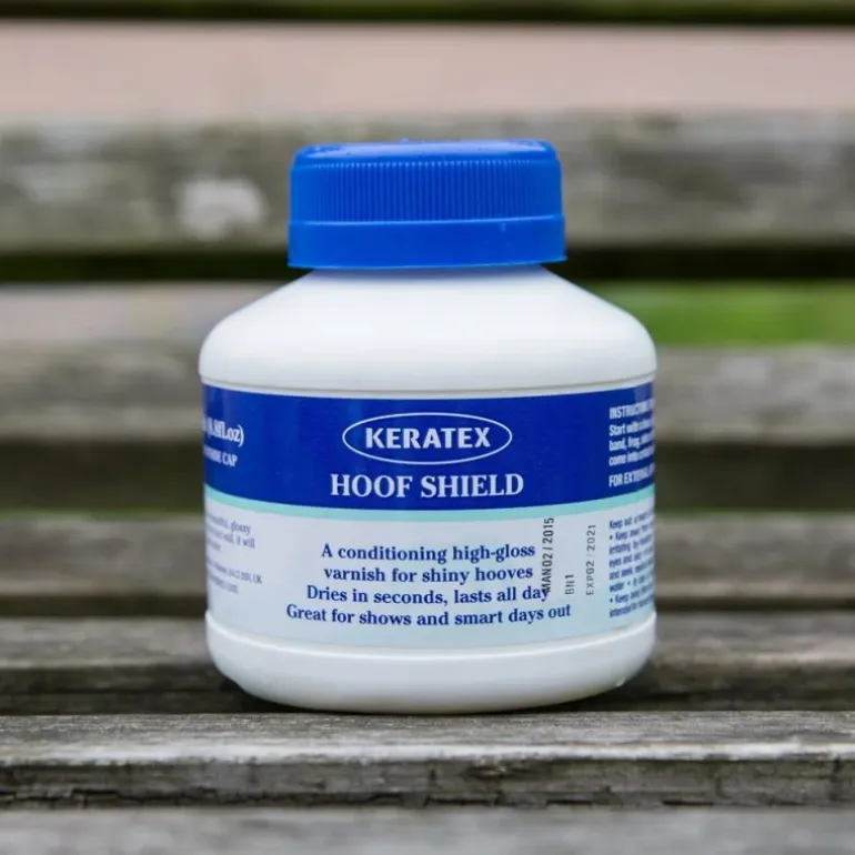 Le vernis Keratex Hoof Shield offre une finition transparente et ultra brillante pour les sabots de votre cheval.