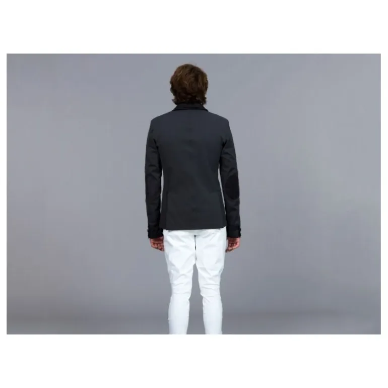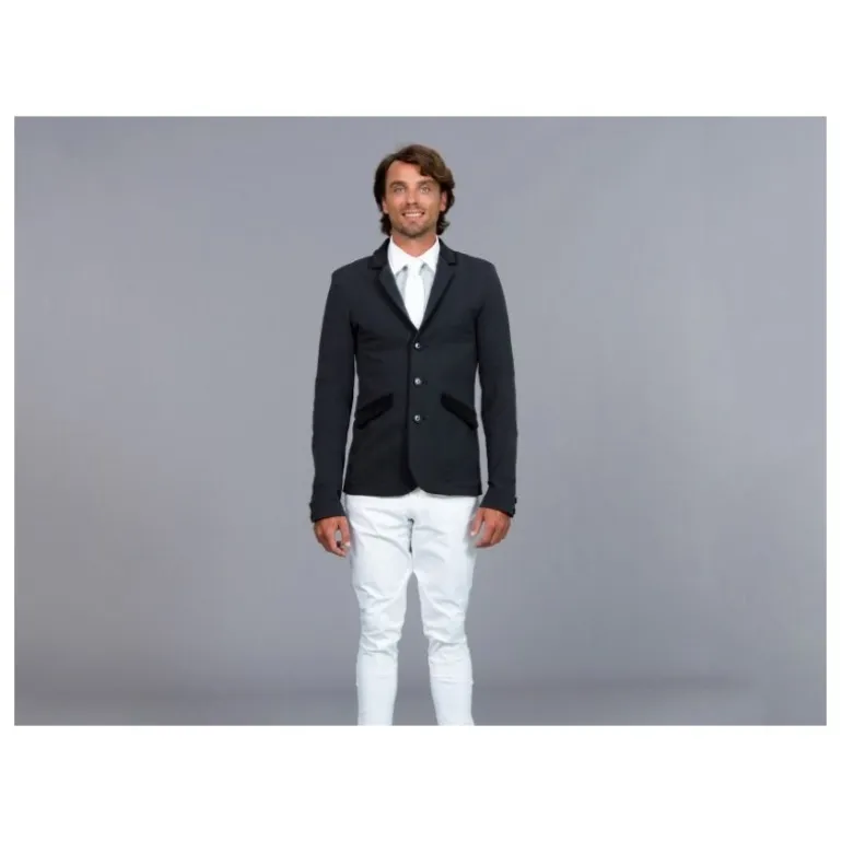 Technique et chic, cette veste de concours personnalisable est à la pointe de l’innovation. Elle est étudiée pour offrir au cavalier qui la porte une entière liberté de mouvement à cheval. Confectionné dans un tissu à la fois stretch et respirant allié à des manches préformées, ce vêtement vous apporte un bien-être optimum dans l’effort. Sa coupe sport et ses coutures spéciales aux passages d’épaules vous assurent l’aisance nécessaire pour concourir en tout confort.